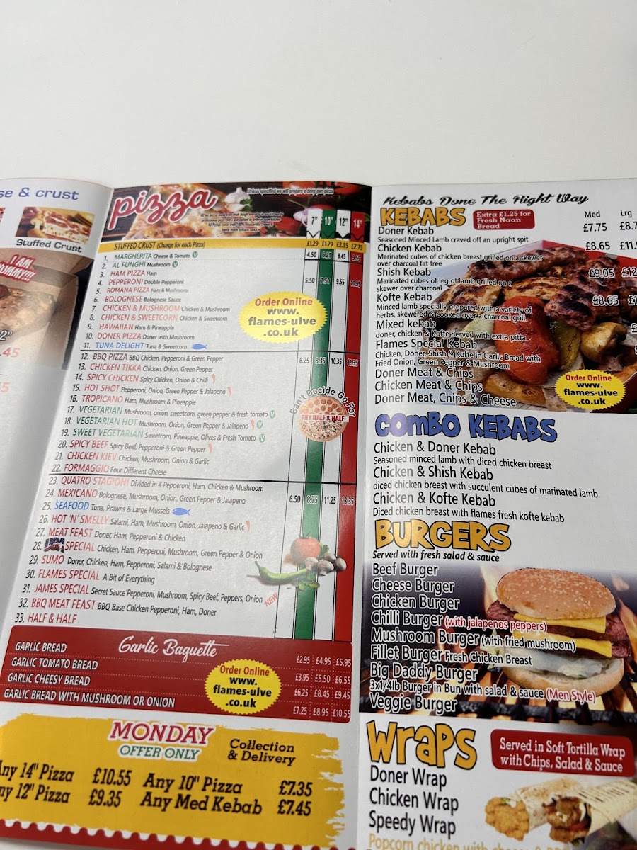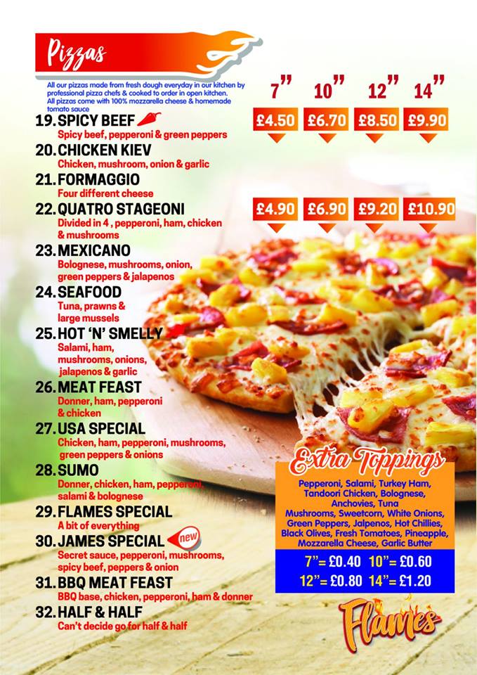 Welcome to Flames Pizzeria, where passion for pizza meets culinary creativity. Nestled at 7 New Market St, Ulverston, this vibrant eatery offers a diverse menu that caters to all tastes. From classic favorites like Margherita and Pepperoni to unique selections such as Chicken Tikka and Hot Shot, each pizza is crafted with quality ingredients and an authentic touch.